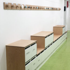 L’équipe investit également le couloir avec les enfants pour des temps d’activités motrices (camions, vélos, transvasements) mais aussi des temps plus calmes (histoires, marionnettes).